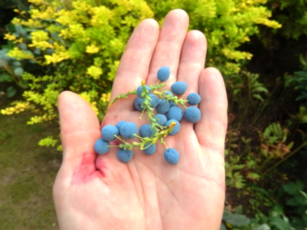Опаньки! Наступим Фаренгейту на пяточки:пройдёмся по фиолетовому ряду! Сколько лет она росла и росла,ну эта:магония падуболистная.Цветение у неё шикарное,да и выкладывал я эти фото ,где-то в теме... А вот ягодки всегда игнорировал!