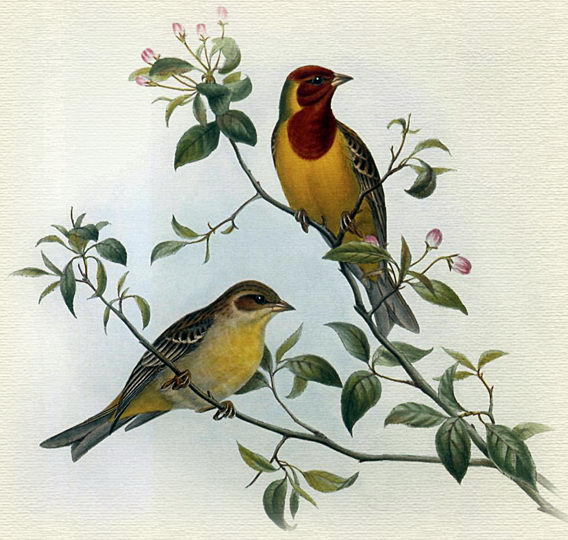 Желчная овсянка (Emberiza bruniceps) - Желчная овсянка своей яркой желтой окраской оперения в комбинации с таким же ярким коричневым цветом легко отличается в природе от других птиц. Самки внешним видом несколько напоминают самок домашнего и черногрудого воробьев, но отличаются от них своим более светлым и почти однотонным цветом брюшной стороны тела. Самцы во время пения обычно усаживаются на вершину куста или высокой травы и напоминают издали желтый цветок.