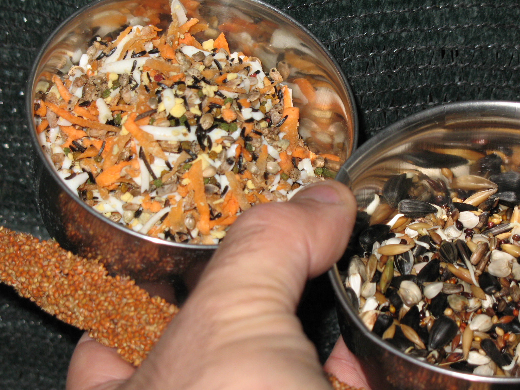 Размер терки выбирается под основного едока. Представленная на фото смесь, служит дополнением к рациону у моих зерноядных птиц, а также в периоды выкармливания птенцов. В зависимости от сезона, состав несколько меняется, путем добавления тех или иных составляющих.