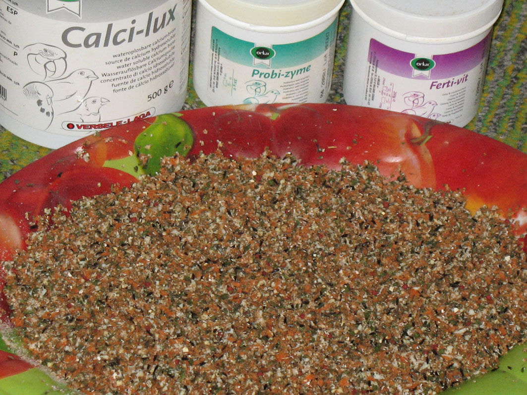[size=150]Wendt´s Weichfresserfutter-Rezeptur[/size] Um ca. 35 kg Trockenmischung herzustellen, werden benötigt: - 0,5 kg Bierhefe - 0,5 kg Haselnüsse (zerkleinert) - 0,5 kg Leinsamen (zerkleinert) - 0,5 kg Mohn - 0,5 kg Weizenkeime - 0,5 kg Weizenkleie - 2,5 kg Bekki´s Pellets für Katzenkinder (zerkleinert) - 2,0 kg Beoperlen (zerkleinert) - 0,5 kg Blütenpollen - 2,0 kg Matzinger´s Gemüseflocken für Hunde - 1,0 kg Sonnenblumenkerne, geschält (zerkleinert) - 5,0 kg Welpenfutter Royal Canin A 3 (zerkleinert) - 2,0 kg Kückenaufzuchtfutter - 5,0 kg Bisquit, z. B. Tortenboden oder Bisquitbruch (zerkleinert) - 1,0 kg Kindernahrung (Trockenmilch-/ brei) oder Lämmeraufzuchtmilch - 3,0 kg Haferflocken (Hälfte zerkleinert) - 3,0 kg Trauben-Nuß-Müsli (zerkleinert) - 5,0 kg Quiko-Kraft- und Aufzuchteifutter[size=150]Рецептура мягкого корма Wendt´s[/size] Для примерного изготовления 35 кг сухой смеси, необходимо: [hide=1]- 0,5 кг пивных дрожжей - 0,5 кг лесных орехов (измельченных) - 0,5 кг льняного семени (измельченных) - 0,5 кг мака - 0,5 кг пророщенного пшеничного зерна - 0,5 кг пшеничных отрубей - 2,5 кг Bekki´s Pellets для котят (измельченные) - 2,0 кг Beo гранулы для майн (измельченные) - 0,5 кг цветочной пыльцы - 2,0 кг овощные хлопья для собак Matzinger´s - 1,0 кг очищенные подсолнечные семечки, (измельченные) - 5,0 кг корм для щенков Royal Canin A 3 (измельченный) - 2,0 кг стартовый комбикорм для цыплят - 5,0 кг бисквит, например, нижняя часть торта или Bisquit bruch (измельченные) - 1,0 кг детского питания (сухое молоко/каша) или молоко разведения ягнят - 3,0 кг овсяных хлопьев (половина измельчено) - 3,0 кг мюслей с орехом и виноградом (измельченные) - 5,0 кг яичный корм для разведения Quiko[/hide]