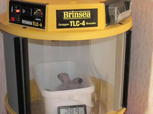 Второй аппарат здорово помогает при ручном докармливании (прежде всего попугаев жако) и слетков различных видов птиц. Внутренний объем брудера позволяет ставить клетку небольших размеров, с птицей требующей тепла (до +35-37С) (заболевшая или самка с проблемой снесения яйца).