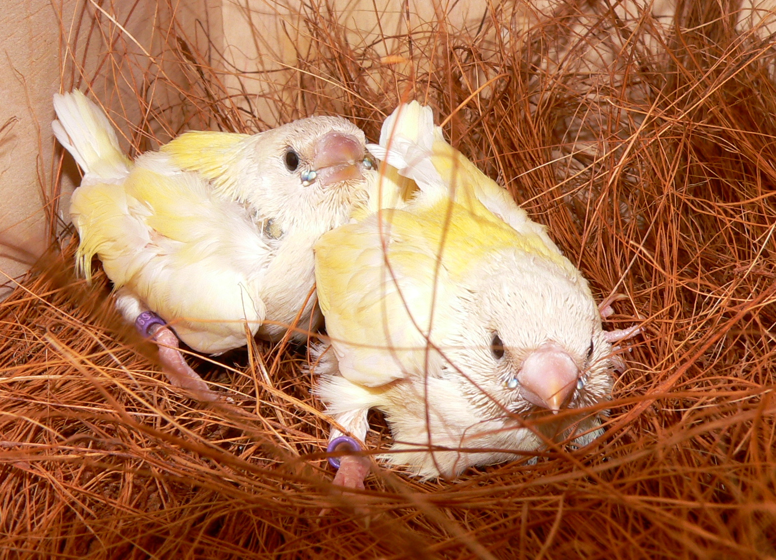 Cамец получен от зеленого белогрудого оранжеголового , щепного на синего самца и от серебристой белогрудой черноголовой самочки ( другими словами - чисто белой). Судя по оперению птенцов - будут они однозначно желтыми...а вот какими желтыми :? - разброс по генетике у них там большой, посмотрим чуть попозже. Сегодня малявки вылетели из гнезда, один из них покрупнее и поголовастее - наверняка самчик, другой и окраской побледнее и помельче ,и форма головы иная, думаю будет самочкой ))). Ну, а там - "Who is who