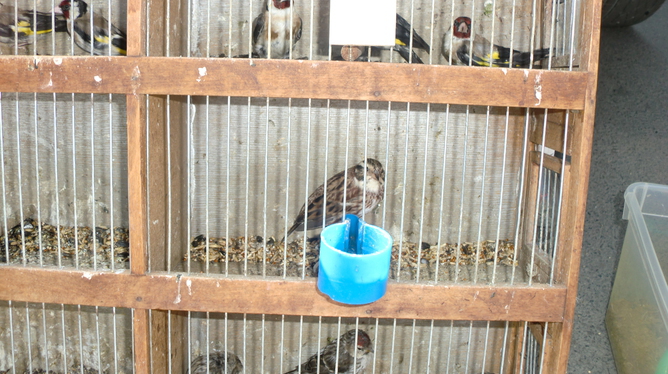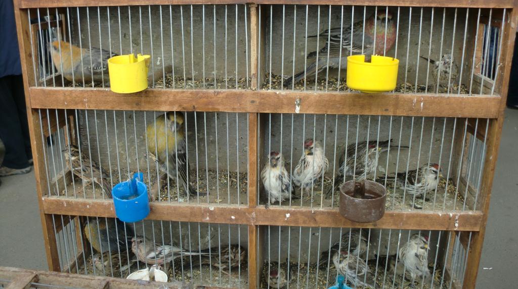 Сегодня 5 апреля 2015 года, на территории Восточно - Кругликовского рынка г. Краснодара проходила ярмарка певчих птиц. Что было видимо или сидело в закрытых клетках, ожидая спроса. Черноголовая славка, восточный соловей, соловей красношейка, чёрный жаворонок, степные жаворонки, полевые жаворонки, зарянки, лесные завирушки, чёрные дрозды, синицы московки, Овсянки ремеза, седоголовая овсянка, горные овсянки, обыкновенные овсянки, дикие перепела ( 5 шт.). Северная птица: снегири, чечётки, урагусы, щеглы маеры, седоголовые щеглы, щуры. Кавказские снегири, красношапочные вьюрки, клесты еловики, репела, чижи, зяблики, зеленушки, щеглы. Пожалуй перечислил всех диких птиц. Погода стояла в меру солнечная и тёплая, встретил много друзей,знакомых и товарищей по страсти.