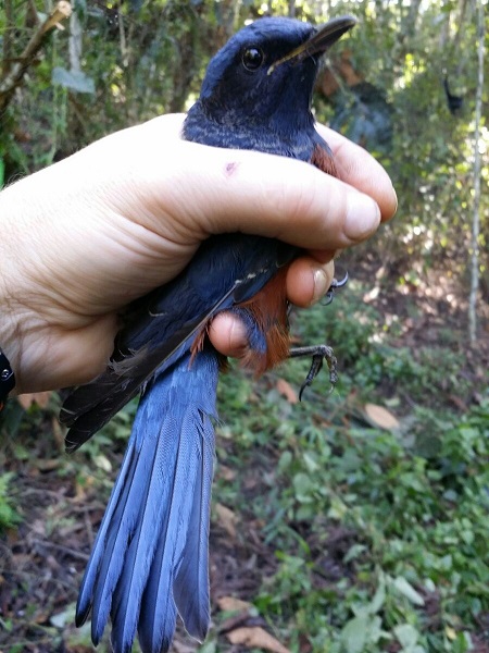 Но и быстрого успеха в плане отлова тоже не случилось. Птица оказалась далеко не глупой. И вот , наконец-то со склона , я увидел как в лучке бьется синий красавец....ну вот, вот она удача. Аккуратно накрываю птицу рукой, чтобы не повредить ей перья, переворачиваю и...не он :shock: , в руках у меня прекрасный экземпляр обыкновенного синего каменного дрозда. Немного успокоившись мы скомбинировали снасти несколько иначе и стали ждать. Не знаю точно, сколько прошло времени, но мне показалось очень долго. И только когда увидели в бинокль движение в лучке, стали вдвоем подходить к снасти....опять синяя спина, неужели опять прокол??? еще несколько шагов - птица поворачивается, гордо взглянув на непрошенных гостей и демонстрируя красный цвет на груди и брюхе.