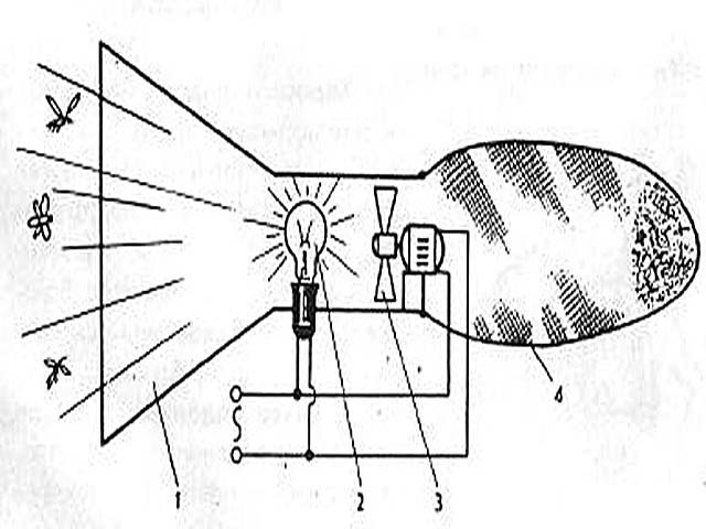 Изделие может иметь произвольные размеры, но схематически выглядит следующим образом: в расширенной части конуса устанавливается лампа, а в узкой части - вентилятор, далее находится накопитель для сбора насекомых. Насекомые летят на свет и вентилятором затягиваются в мешок. Насекомосос! Насекомых можно обездвижить в холодильнике, не вынимая из мешка, после чего скормить, либо высушить - сделав таким образом «заготовку» впрок.