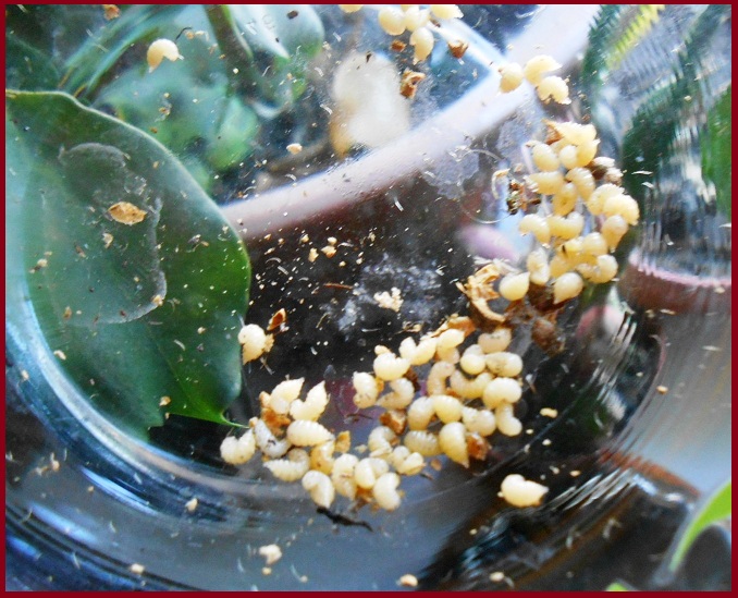 Как показала практика, сбор не так уж утомителен и в урожайный год можно насобирать более-менее приличное количество этих личинок. Конечно, много птиц, таким образом не прокормить, но побаловать капризного или захандрившего питомца можно. Были моменты, когда эти мелкие личинки здорово выручили с выкармливанием птенцов золотистогрудых астрильдов (другие живые корма были не доступны) и помогли при ловле усатых синиц и крапивников в западки.